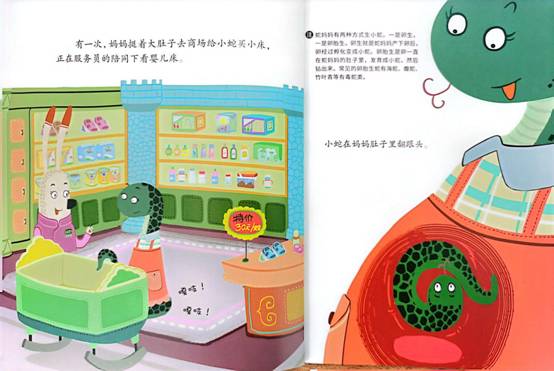 有一次,妈妈挺着大肚子去商场给小蛇买小床,正在服务员的陪同下看婴儿床。
