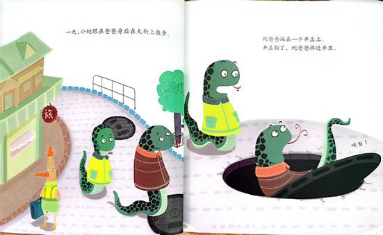 井盖翻了,蛇爸爸掉进井里。