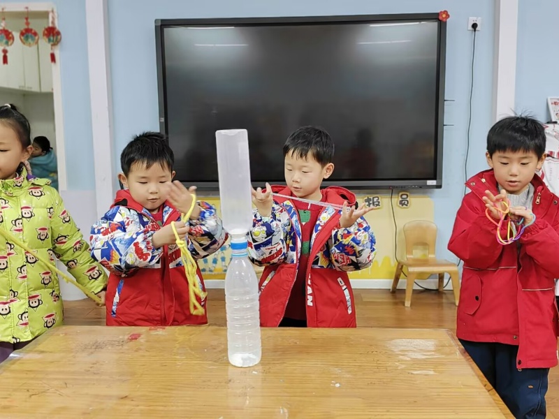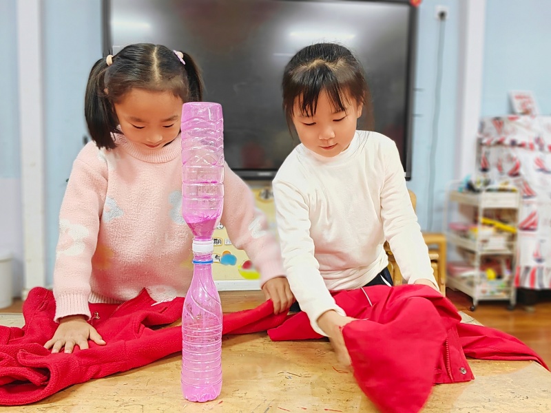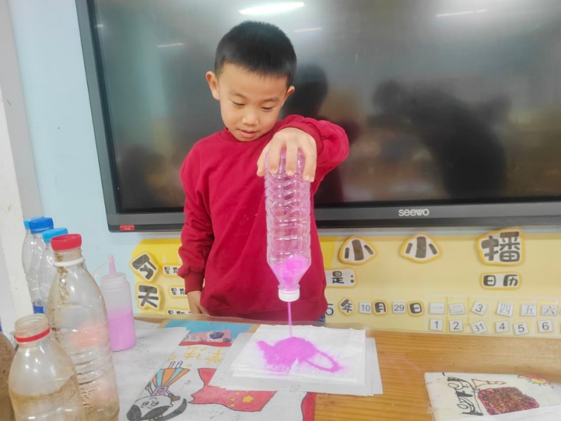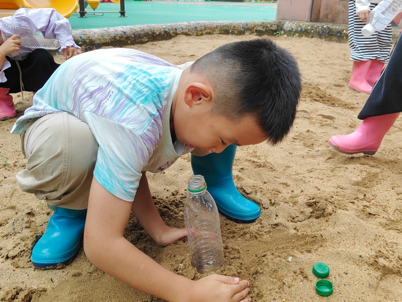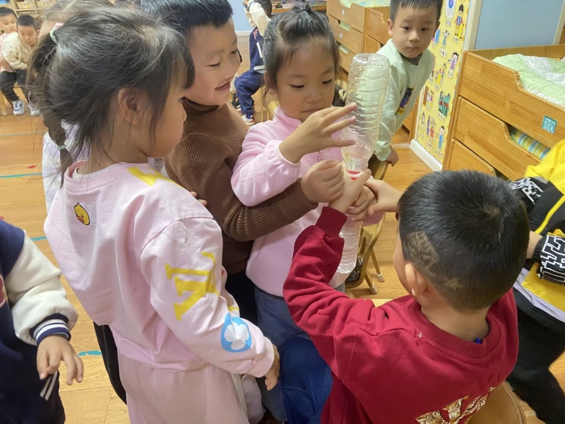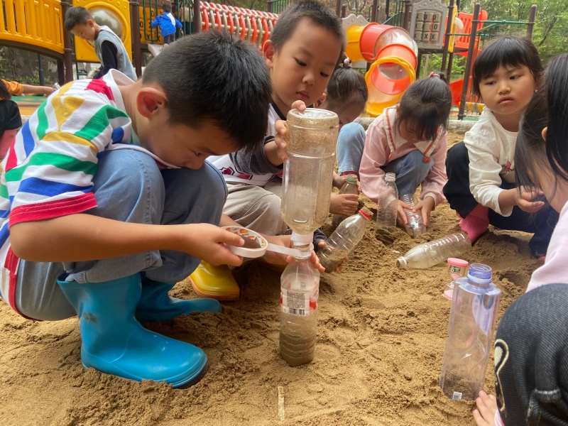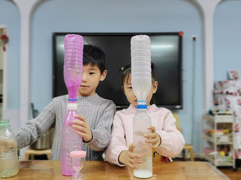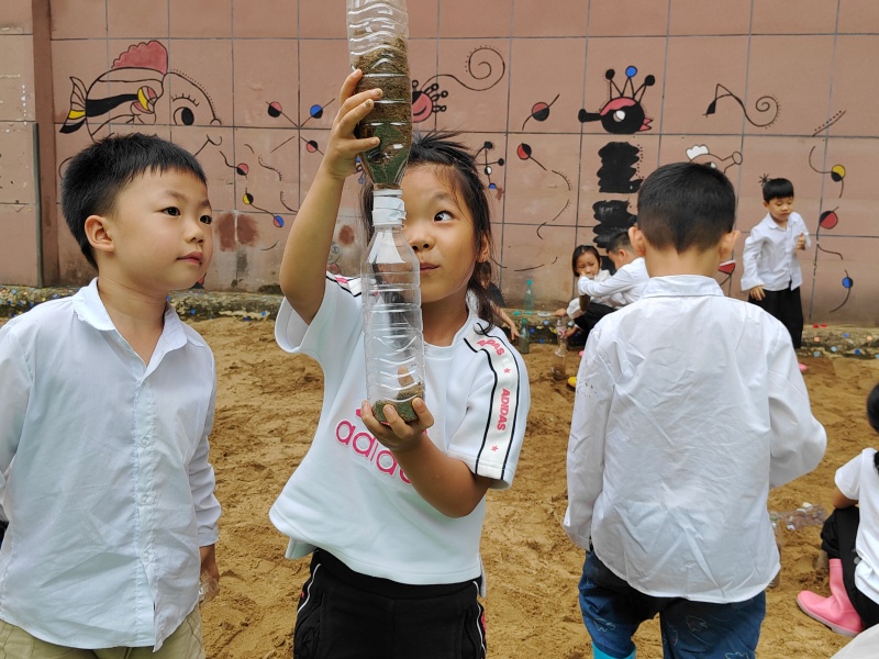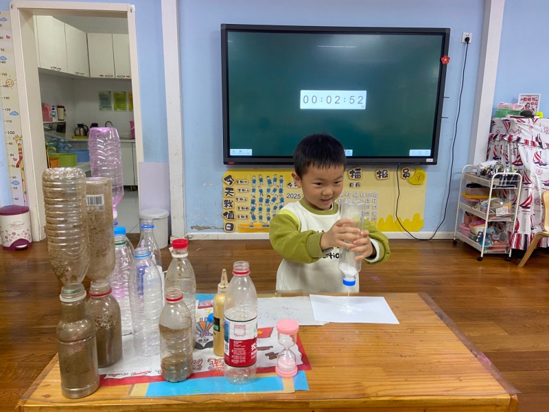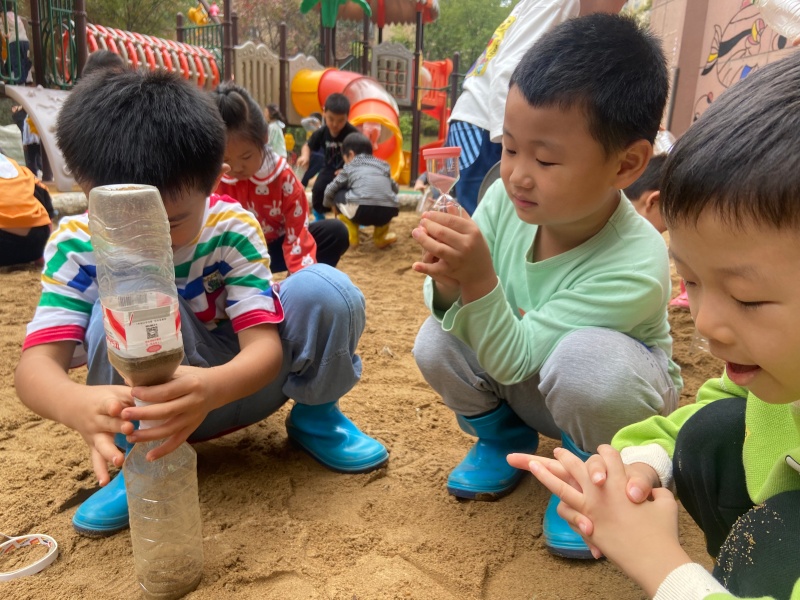 按照讨论的结果,孩子们先找来筛子,一点点将沙池里的沙子筛细,再把细沙摊在盘子里,放在太阳下晒干。在老师的帮助下,孩子们选择了瓶盖较薄的塑料瓶,教师用打孔器在瓶盖上打了一个小孔。孩子们小心翼翼地将细沙装进瓶子里,将带孔的瓶盖拧紧,再把另一个瓶子扣在上面。“见证奇迹的时刻到啦!”孩子们屏住呼吸,倒置瓶子,细沙顺着瓶盖的小孔,缓缓地、流畅地流了下来!“成功啦!我们的沙漏成功啦!” 欢呼声在活动室里回荡。