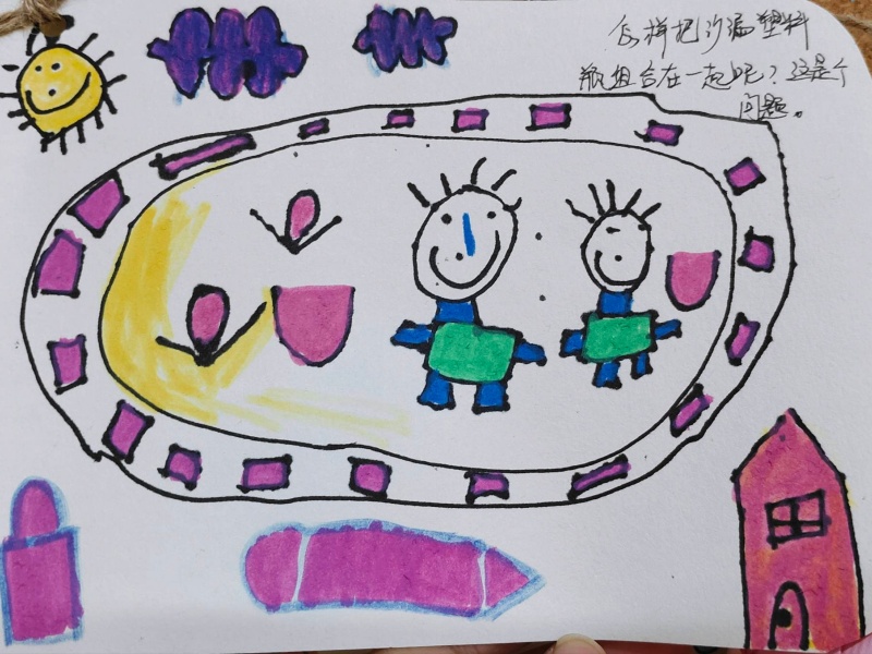 探索结束后,孩子们围坐在一起复盘。“为什么瓶子粘不上呀?”“我发现胶上全是沙子!”一个孩子指着掉在地上的双面胶说道。经过讨论,大家总结出原因:沙子粘在瓶口,导致双面胶无法贴合;虽然两个人合作能让瓶子暂时粘上,但并不牢固。而沙子漏不下来,是因为沙池里的沙子又湿又粗,还混着小石子。“得用干的沙子!”“还要细一点的,没有石头的!” 孩子们你一言我一语,为第二次探索明确了方向。