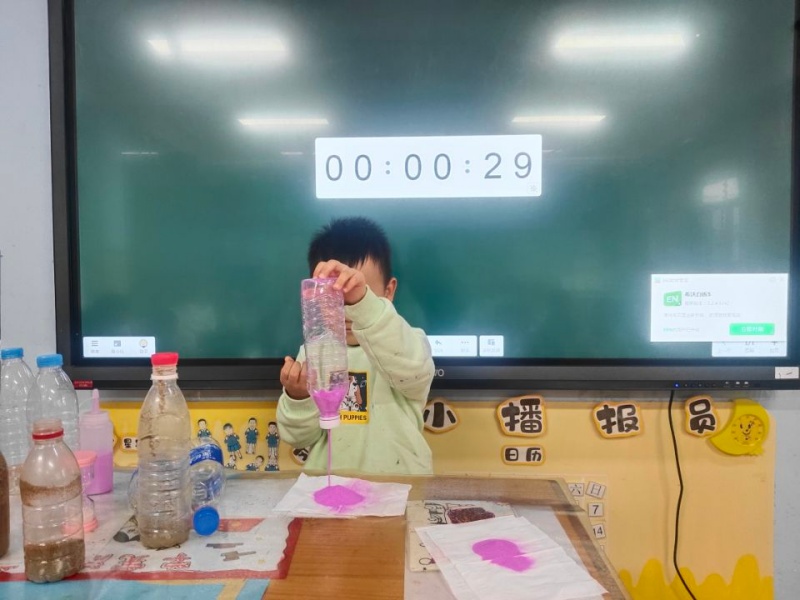 “我们的沙漏能计时多久呢?”成功的喜悦过后,一个新的问题冒了出来。“我们数数吧,数到100就是100秒!”有孩子提议。“不行不行,有的人数得快,有的人数得慢,不准!”逸逸立刻反驳。他提议到:“老师有计时器,我们让沙漏和计时器一起开始,计时器到1分钟,看看沙漏里的沙子流了多少,流出的沙子就是1分钟的量!”这个想法得到了大家的认可。孩子们反复尝试,终于做出了1分钟的沙漏。可很快又有新发现:“为什么我的沙漏流完是1分钟,他的是2分钟呢?”大家拆开沙漏对比,发现原来是瓶盖小孔的大小不一样——孔越大,沙子流得越快,计时越短;孔越小,沙子流得越慢,计时越长。顺着这个发现,孩子们调整小孔大小和沙子量,成功做出1分钟、3分钟、5分钟的沙漏。