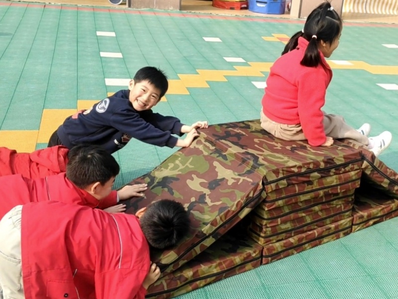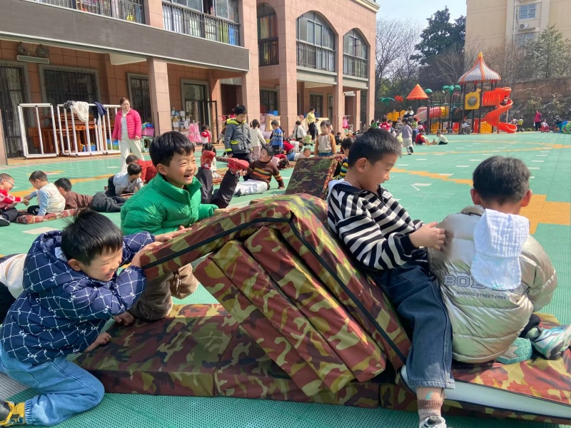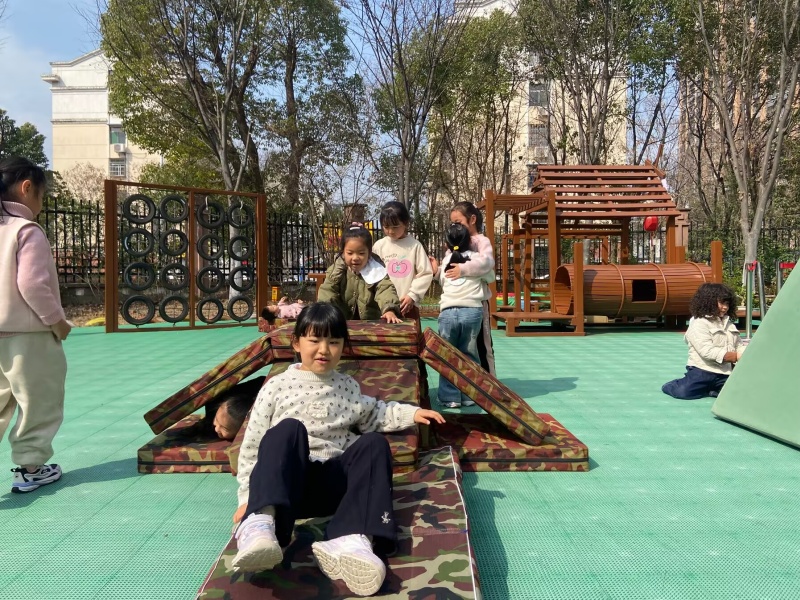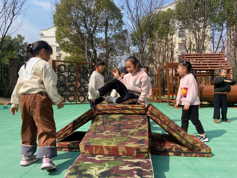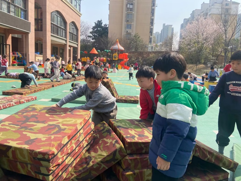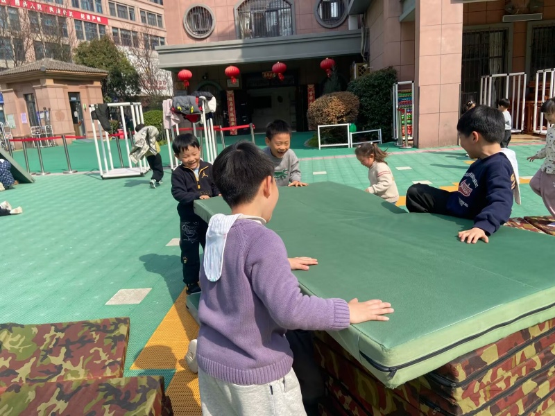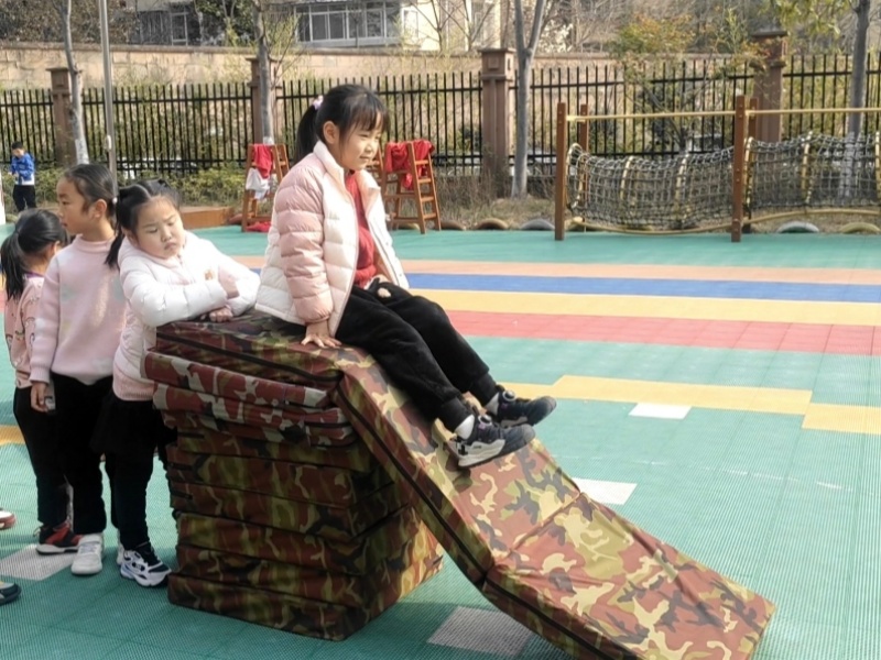 三月的阳光暖融融,瞧,操场上热闹非凡。大二班的孩子们正兴致勃勃地玩着自己动手搭建的垫子滑滑梯。