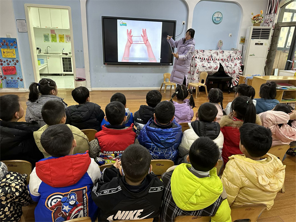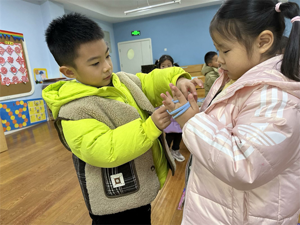 孩子们已经不满足一个人翻花绳,他们在尝试两人、多人一组进行合作翻花绳,“我出左手,你出左手。我来挑你的,你来挑我的。”孩子们会在一切空闲的时候翻花绳,梳头时、就餐后,喝水等所有的等待环节,总能看到孩子们迫不及待的拿出花绳来翻,也通过这样一根小小的花绳窥探到了传统游戏的乐趣!