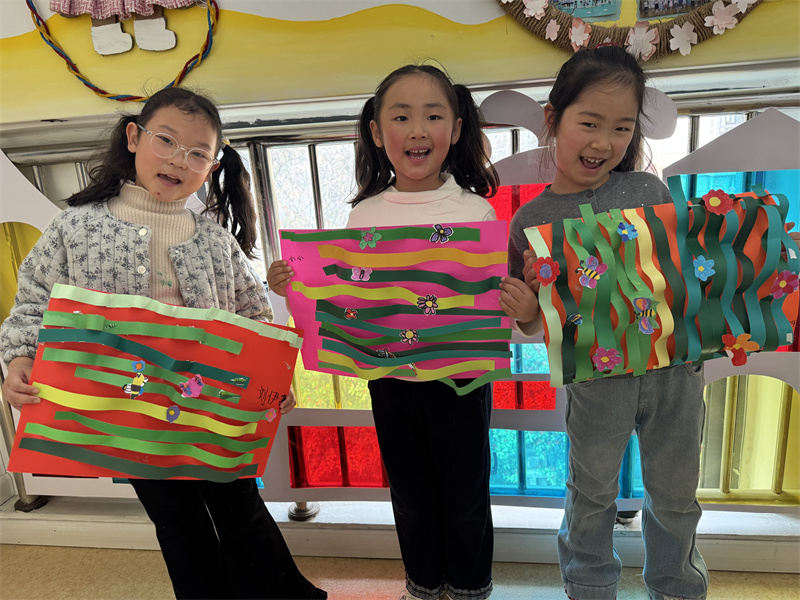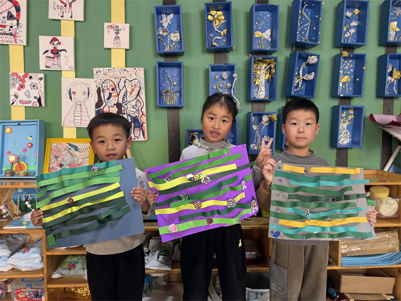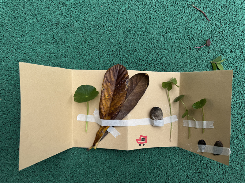 活动中,孩子们化身小小探险家,在老师带领下走进自然,仔细观察、收集形态各异的树叶、花瓣与枝条,用小手触摸春天的肌理。回到创作现场后,孩子们将自然材料与撕纸、简笔画巧妙结合,通过粘贴、拼贴、添画等方式,把春日生机定格在一本本折叠小书中。