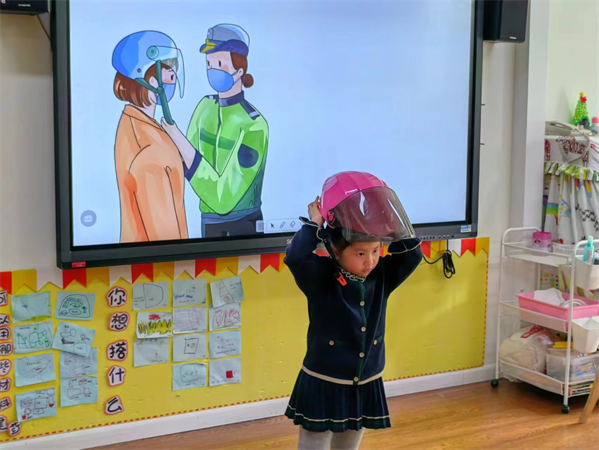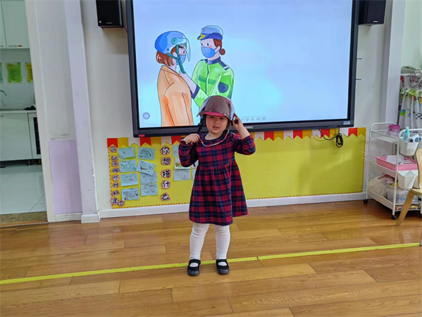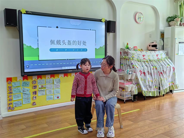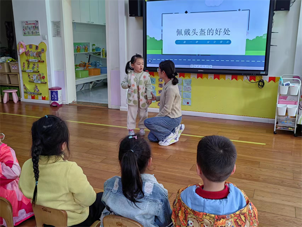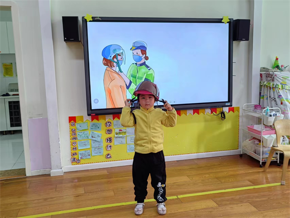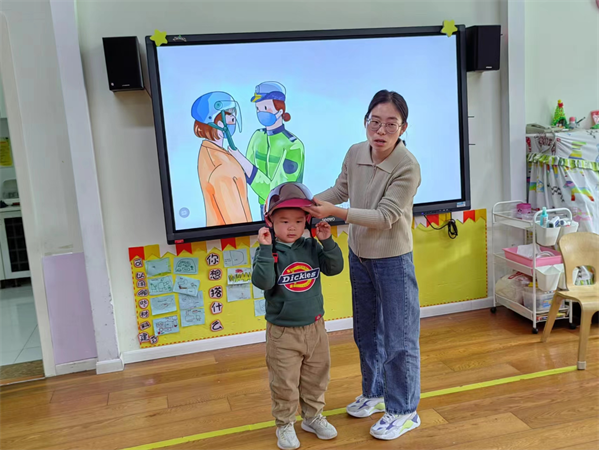 班级老师结合本班幼儿年龄特点,通过交通安全视频、教具等方式帮助幼儿了解基本的交通规则,用生动的语言引导幼儿认识头盔。幼儿通过亲身感知、实际操作、亲身体验佩戴头盔的正确步骤,懂得了如何正确的佩戴安全头盔,提升了自我防护意识。