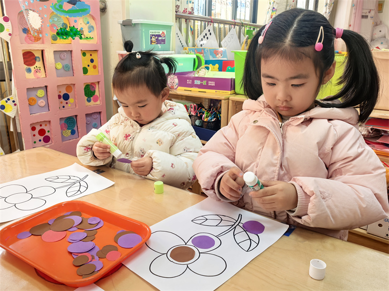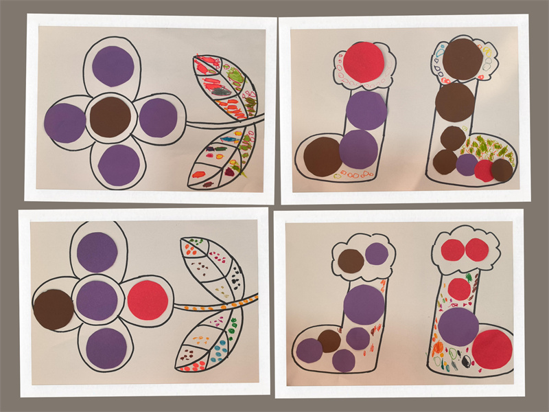孩子们用彩色的圆贴纸,蘸上固体胶,开心地贴在画纸上,手握画笔画出密密麻麻的小点点。这些或大或小、或疏或密的圆点,仿佛复刻了吴冠中笔下点缀江南水乡的繁花,画笔在画纸上跃动出童真的韵律。