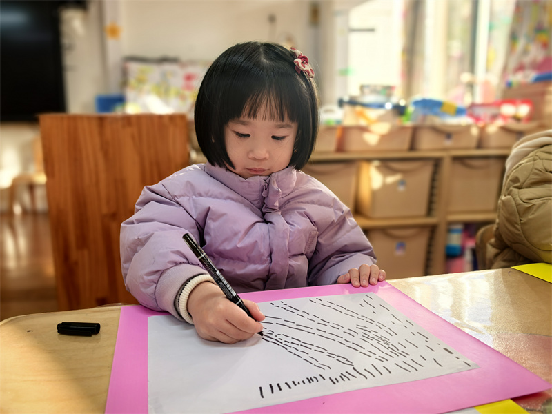 孩子们循着吴冠中先生《雨花江》的笔墨韵味,画出或疏或密、或长或短、或粗或细的线条。这些线条恰似江畔飘落的雨丝,交织出朦胧的水乡意境,灵动又温柔。