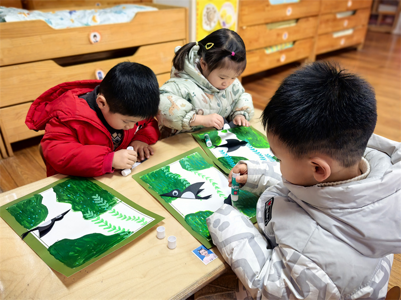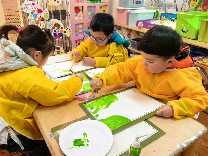 孩子们用色块填充画面,大块的蓝是天空,小块的绿是草地,不同形状的色块拼接组合,让画纸变成了孩子们心中的艺术天地。