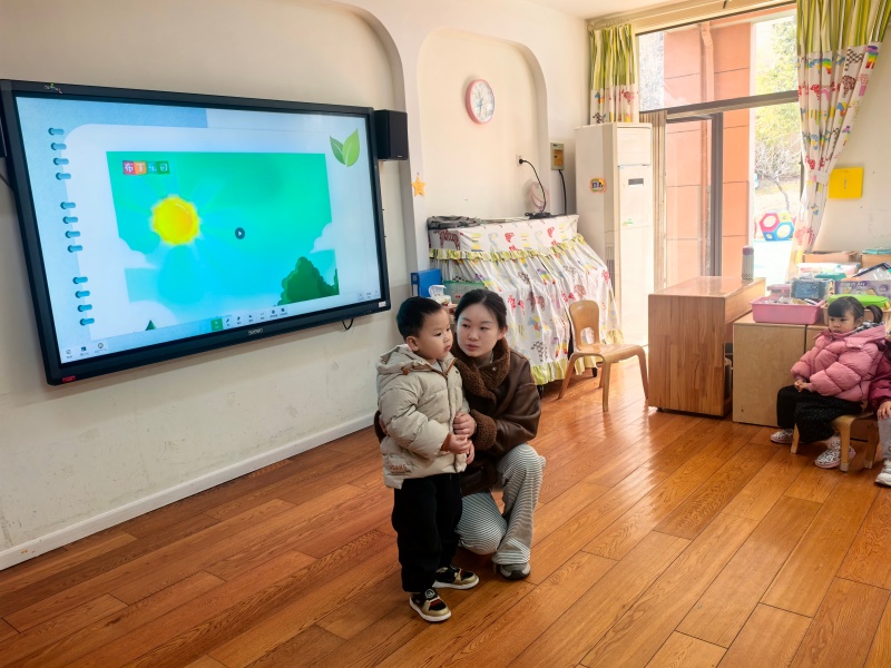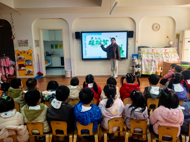 活动伊始,师幼围坐在一起,在轻松的互动分享中感知植树节的相关知识。随后,教师借助生动的视频、直观的图片,向孩子们细致介绍植树节的由来保护树木的意义。