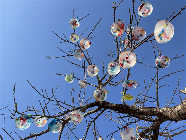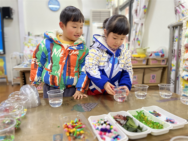 “冰是什么样子的呢?”“冰是硬硬的!”“摸起来凉凉的、滑滑的。”“看起来是透明的。”……孩子们纷纷回答着。老师为孩子们准备了落叶、彩色的剪纸、孩子喜欢的小饰品和宝石,装上水之后,孩子们惊喜的说着:“哇,太漂亮了。”