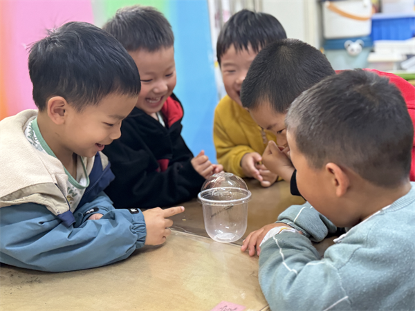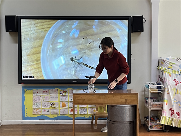午餐后户外散步时,孩子们在操场上看到了一只小蜻蜓,他们对蜻蜓充满了好奇,围着蜻蜓看了又看,不停地问着问题。由此,老师将蜻蜓请进班级,带领孩子们仔细观察蜻蜓的身体结构;观看了蜻蜓科普视频,孩子们了解了蜻蜓是益虫,它的“大墨镜”眼睛里有很多的小眼睛……原来一只小小的蜻蜓,身上竟藏了这么多的“秘密”。随后,孩子们来到户外不舍地放飞蜻蜓。