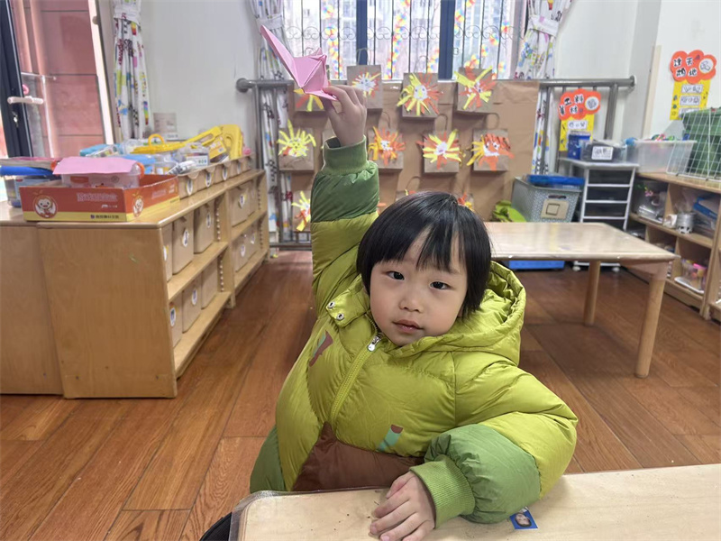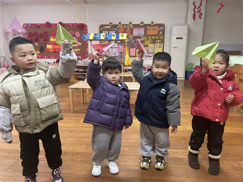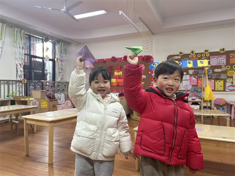 当一张张平整的彩纸在他们的手中逐渐成型为有趣的作品时,成就感洋溢在每张小脸上。活动最后,孩子们兴奋地展示着自己的作品,纷纷举着“小飞机”在教室里模拟飞翔。小小的作品,承载着大大的快乐与想象。