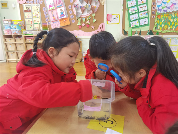 活动前,老师带领孩子们通过《小蝌蚪找妈妈》绘本故事,感受小蝌蚪的成长变化,了解青蛙的特征。随后,老师把小蝌蚪分组,孩子们找来放大镜仔细观察,并展开了新一轮的讨论:“老师,小蝌蚪要午睡吗?”“小蝌蚪几天才能长出后腿?”“什么时候能变成青蛙呢?”……