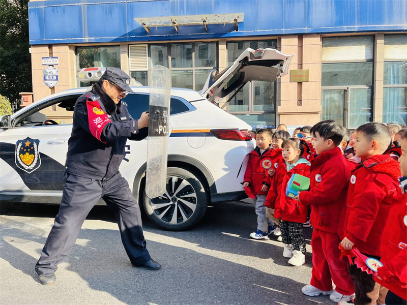 随后,民警为孩子们详细介绍了警车的功能,以及警棍、盾牌的使用方法,孩子们听得津津有味,不时发出惊叹声。