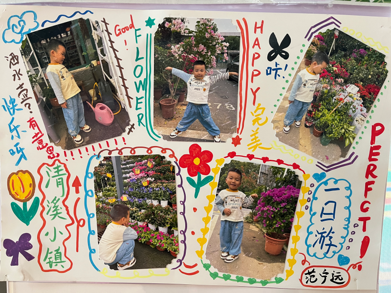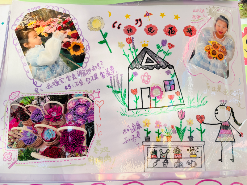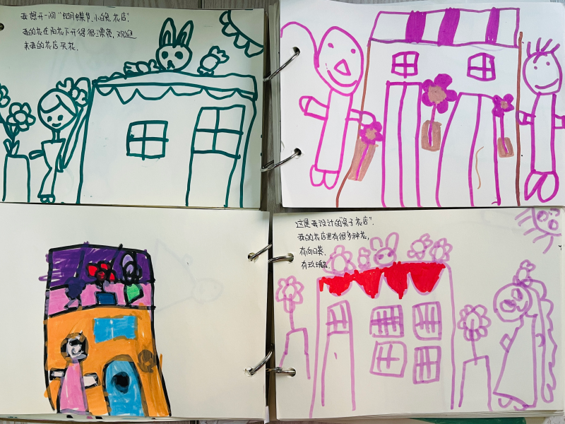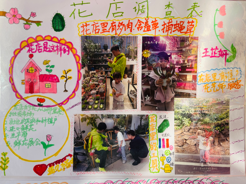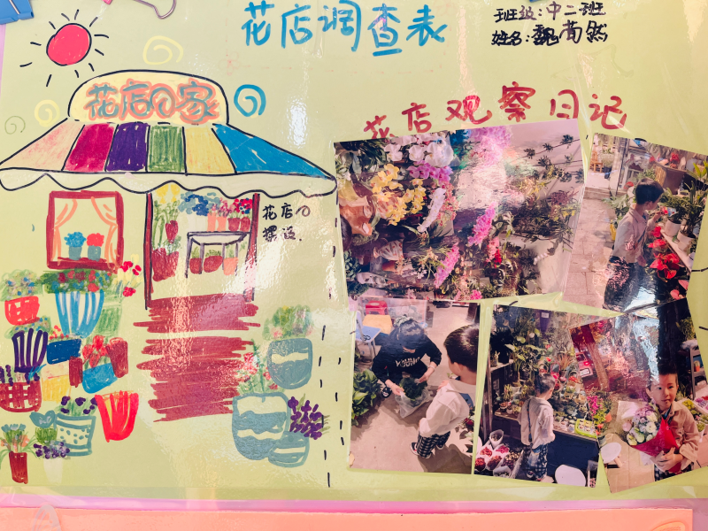 真正的花店又是什么样子的呢?他们走进生活中的花店进行实地参观,近距离感受弥漫的花香。参观结束后,孩子们用稚嫩的语言与生动的图画,反馈自己的所见所感,这些分享汇聚成珍贵的体验,让大家对班级花店的诞生更加期待。