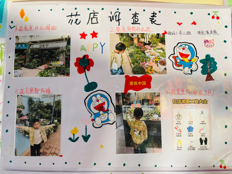 教师思考:《幼儿园教育指导纲要》中指出:“家庭是幼儿园重要的合作伙伴。应本着尊重、平等、合作的原则,争取家长的理解、支持和主动参与,并积极支持、帮助家长提高教育能力。”通过亲子实践活动,孩子们与家长一起去了解花店的店名以及寓意、发现各种各样美丽的花、观察店员们的工作,对花店的方方面面都有所了解,并鼓励孩子回到幼儿园与同伴交流分享,相互学习,为花店游戏的开展做好前期经验准备。