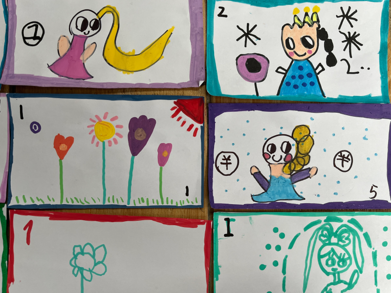 游戏时需要用到钱币才能进行买卖,孩子们利用自己最擅长的方式绘制钱币,在白纸上绘制钱币,并用自己喜欢的图案进行装饰,其中包含1元、2元和5元等等。