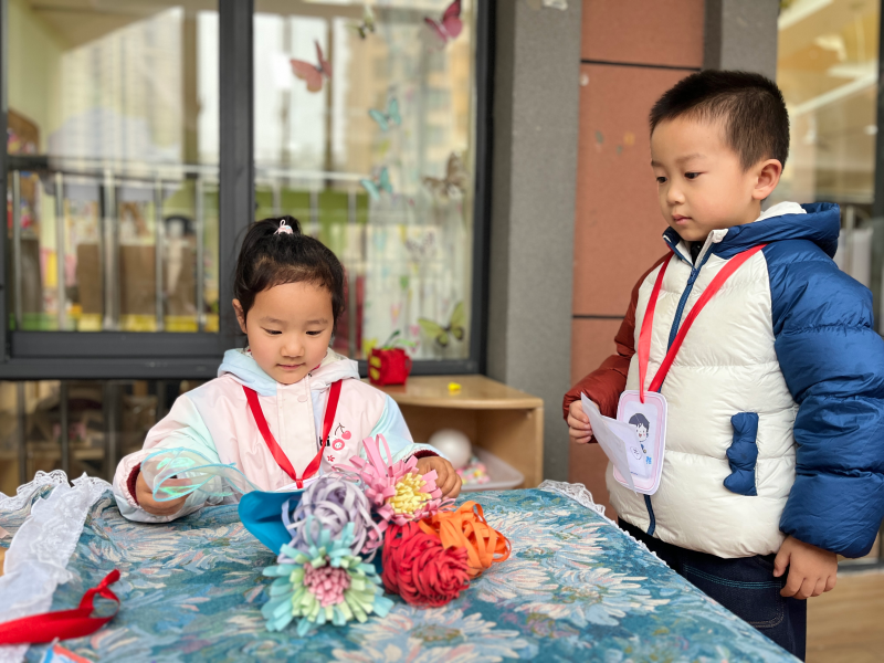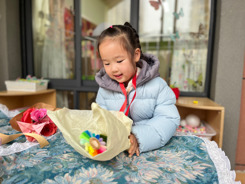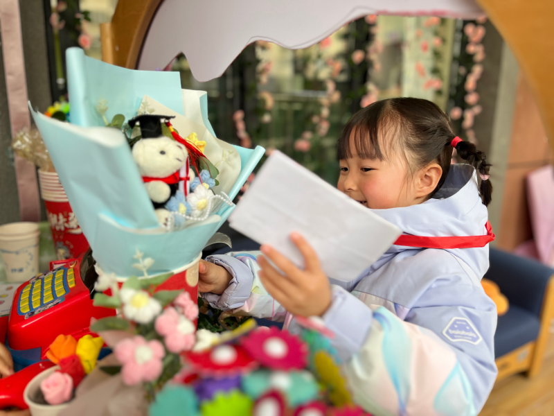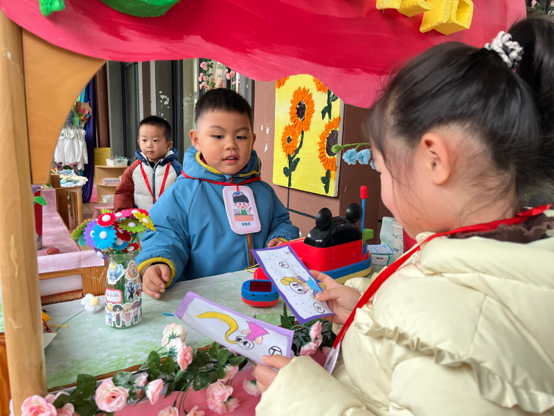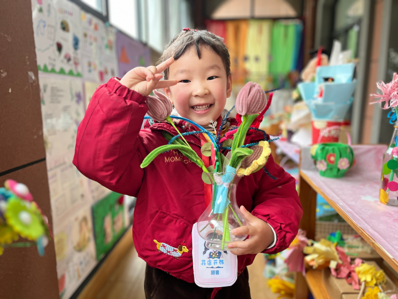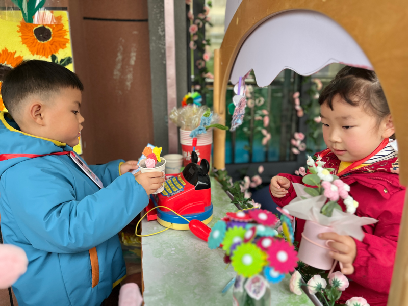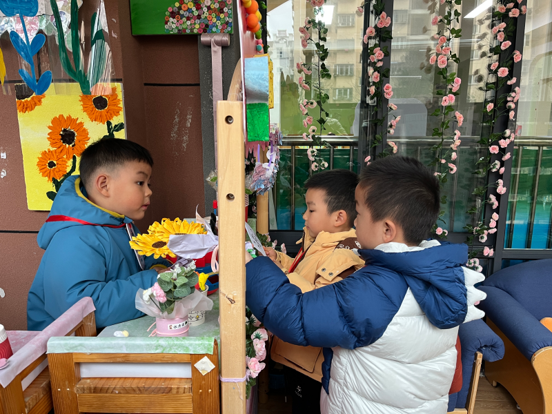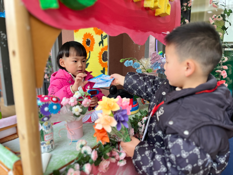 在班级角色游戏区,孩子们携手同心,以天马行空的创意与灵巧的双手,共同打造出一间温馨又充满童趣的“一间花店”。其间,孩子们也在不断发现问题、解决问题的过程中,让花店逐渐成为欢乐与创意的小天地。在这里,每一位“顾客”都能沉浸在游戏的乐趣中,感受着童真与美好。