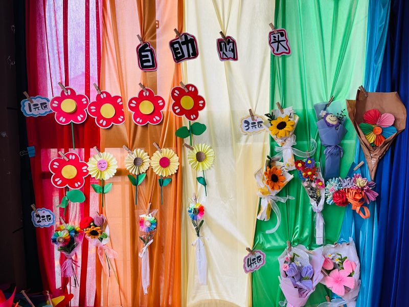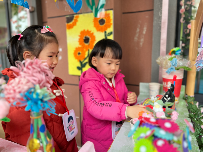 孩子们纷纷提议,“自己在家时多制作一些手工花,带到幼儿园里进行包装售卖,这样我们的货架上满满当当的,就不容易卖光了。”