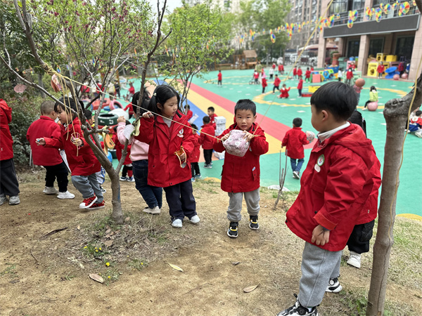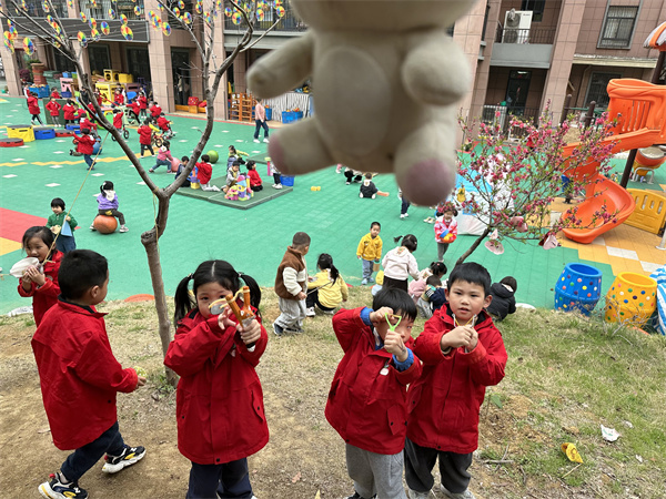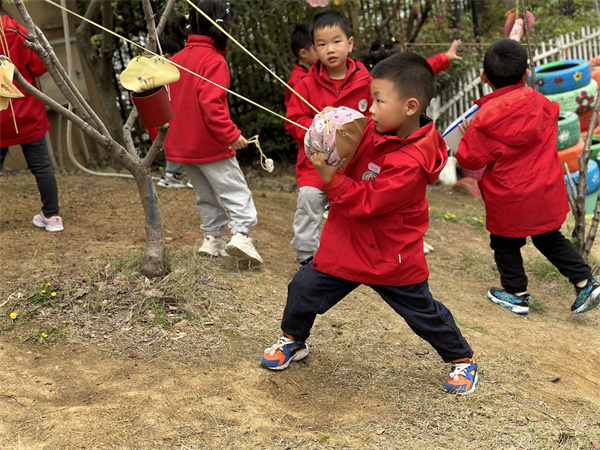 接下来就是有趣的打弹弓游戏,在进行弹弓游戏中,想要更好地打中目标,瞄准动作很重要。在探索瞄准动时,孩子们有的单脚站立;有的双脚踮起;有的做半蹲弓步等等。“我一下就打中了箱子,耶!”“树上高高的公仔必须用力向后向下拉才可能打中哦。”“我们一起来比赛谁能打中小玩偶。”孩子们玩的不亦乐乎……