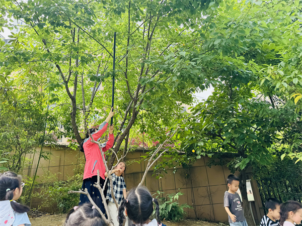 黄澄澄的杏果一颗颗挂在树上,缀满枝头。老师拿来竹竿敲打杏树,黄橙橙的杏果摇摇晃晃地摔落下来。孩子们兴奋极了,有的忙着捡杏果,还有的在加油当啦啦队,采摘现场热火朝天,采摘过程热情满满,在行动中施展自己的本领,体验采摘的快乐。