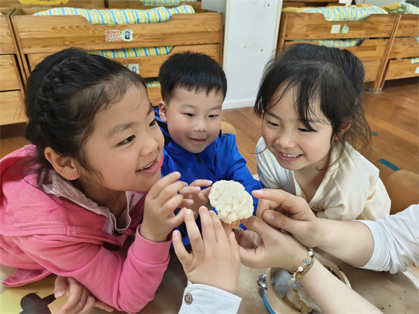 “老师,菌包变颜色了!”“快看!这里长出了白色的小点点!”种植活动启动后,孩子们每天到幼儿园的第一件事就是跑到自然角观察蘑菇的变化。经过两周的精心照料,菌菇包中终于冒出了密密麻麻的“小伞”——平菇、猴头菇簇拥成团,引得孩子们欢呼雀跃。他们用放大镜仔细观察菌丝的生长,用画笔记录下蘑菇每一天的“新模样”。蘑菇成熟后,师幼共同将蘑菇采摘下来,并进行观察、对比,有些小朋友说:“猴头菇摸起来软软的,好像我盖的被子啊。”“我觉得好像小羊,它好像身上有很多的毛!”针对孩子们的发现,老师也抓住教育契机,引导孩子们讨论光照、湿度对蘑菇生长的影响,将科学探究融入生活。