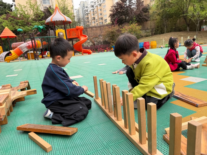 活动伊始,老师通过图片、简单讲解,带领孩子们认识不同桥梁的造型与结构,激发孩子们的搭建兴趣。来到户外,宽敞的场地、厚实的木质积木让孩子们兴奋不已,大家自由分组,分工合作,热火朝天地开启搭建之旅。