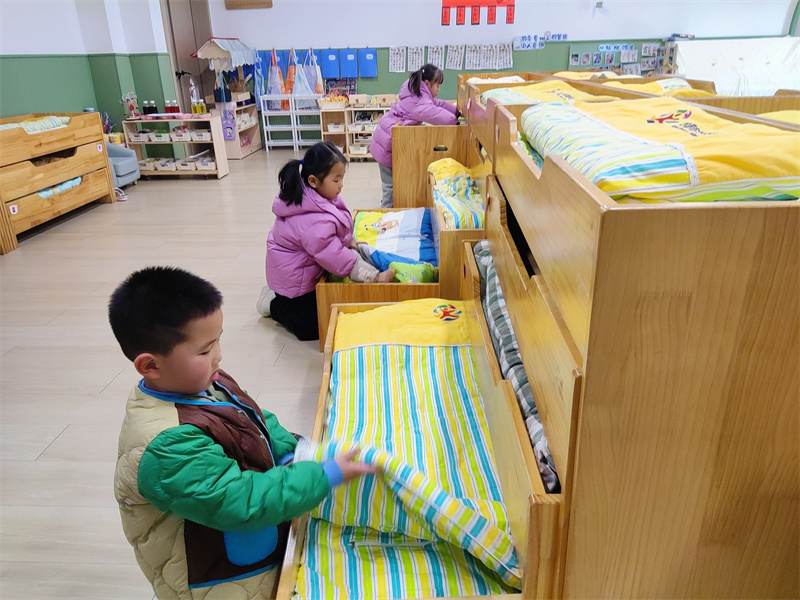 互动环节精彩纷呈,“卫生小达人闯关”游戏点燃孩子们的热情:第一关“铺被小能手”,孩子们来到午睡室,学习叠被子、整理床铺,用行动践行生活自理能力;第二关“闪亮整理秀”,听到哨声,孩子们快速按要求整理好身上的衣服;第三关“卫生小能手”,孩子们分组检查班级卫生,整理玩具,用行动践行卫生习惯,成就感满满。