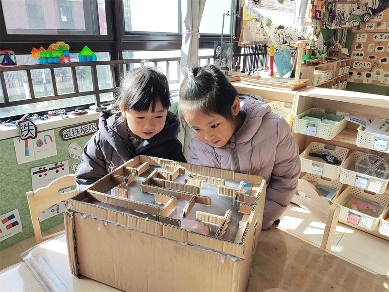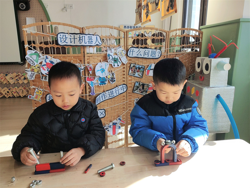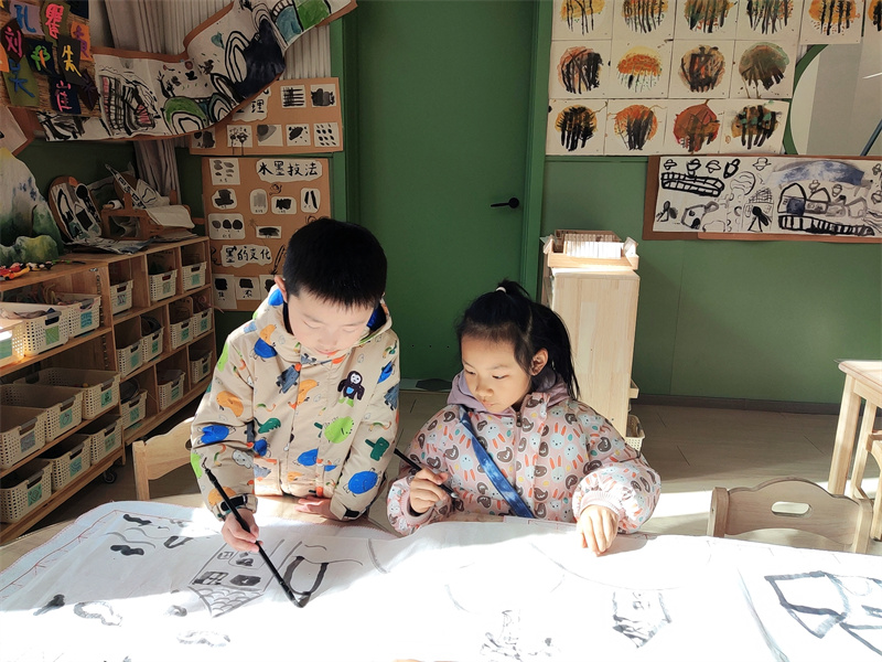 科学区里,孩子们手持磁铁与螺丝、螺母等材料,专注搭建专属 “磁铁机器人”,成就感溢满脸庞;一旁的 “磁铁迷宫” 同样精彩,孩子们用磁铁操控,时而屏息调整角度,时而欢呼庆祝,在游戏中直观感受磁铁吸引力,萌发科学探究兴趣。美工区水墨飘香,孩子们手握毛笔在宣纸上轻轻晕染,或涂抹灵动线条,静静感受传统水墨画的独特魅力。