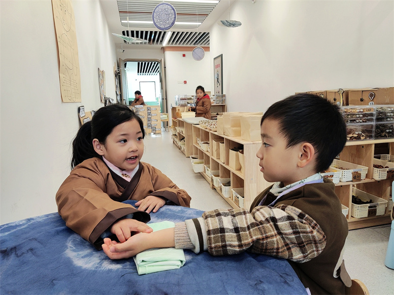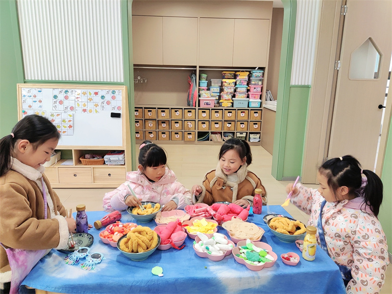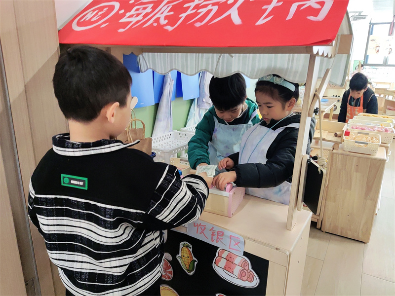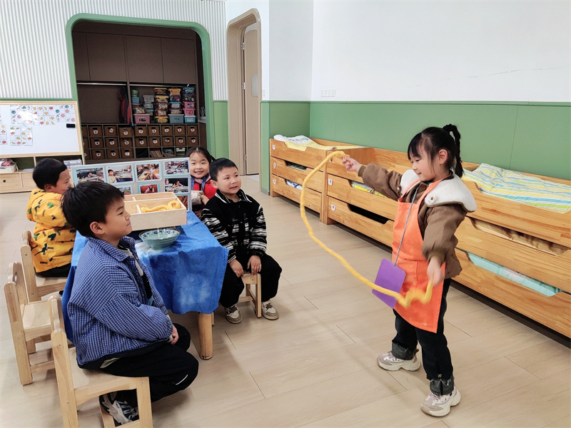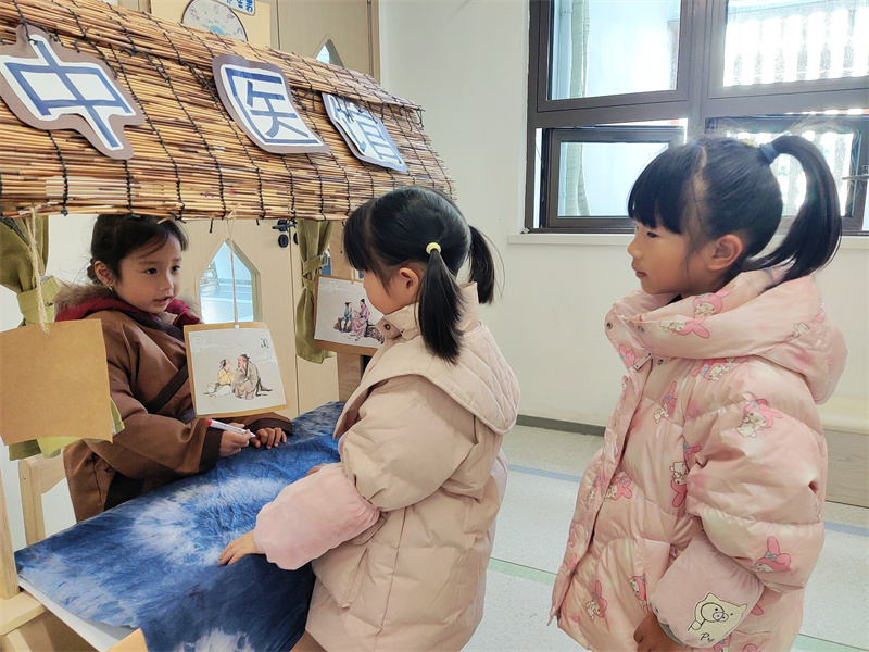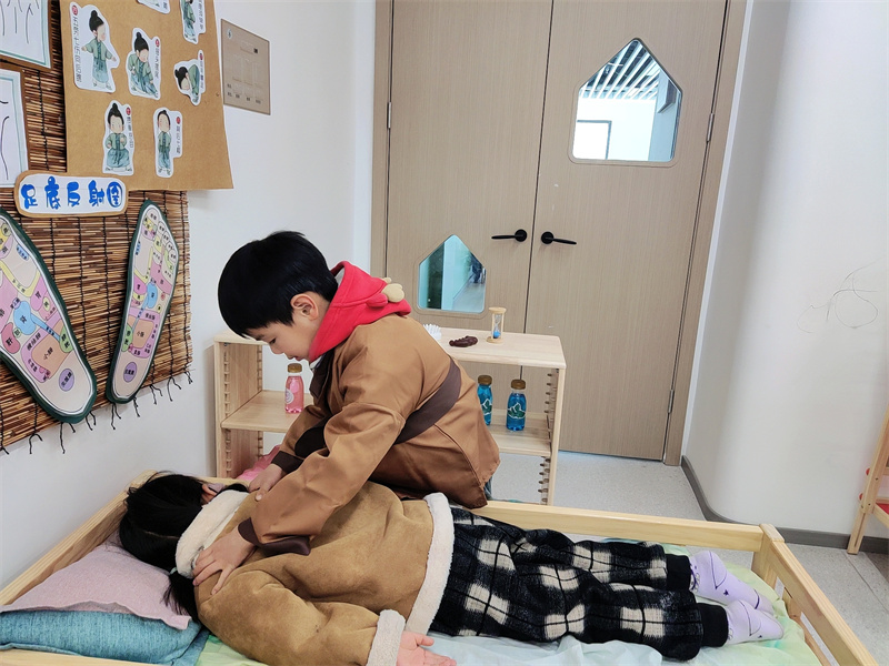 角色区热闹非凡:“海底捞火锅店” 中,小服务员热情招呼 “顾客”,端上自制 “美食”,礼貌又贴心;“中医馆” 内,小医师有模有样地为同伴 “号脉”、询问 “病情”,依据 “诊断结果” 选草药、包药,还模仿按摩推拿缓解 “患者” 不适,在角色扮演中了解中医文化,提升社交与表达能力。