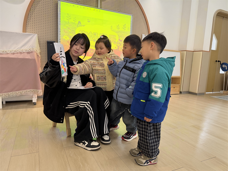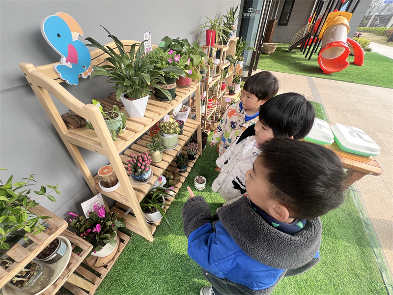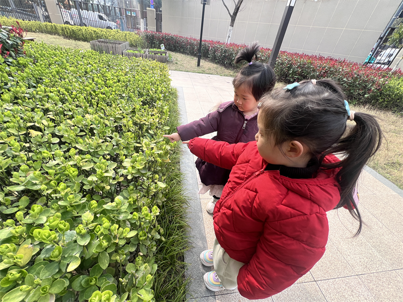 活动开始后,老师和孩子们观察、讨论春日的阳光、嫩绿的新芽与绽放的花朵,引导他们仔细观察春天的变化。