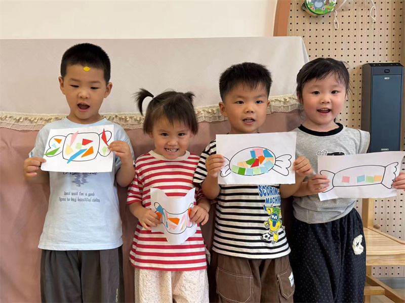有的挑选同色系纸碎,做出“单色糖果”;有的则把彩色纸碎混在一起,打造“彩虹糖果”;还有的孩子互相分享纸碎,“我的绿色给你,你的粉色借我好不好?”当看到自己的“作品”时,大家举着糖果说:“我的糖果最漂亮!”