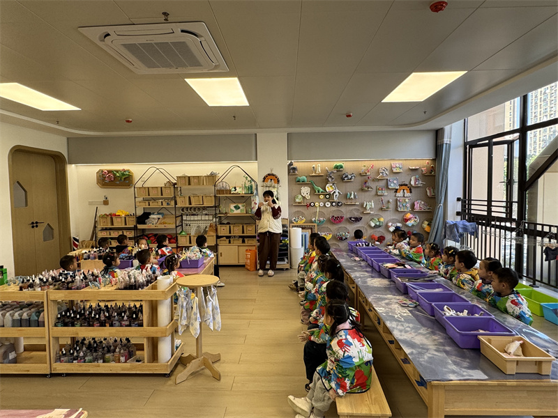 当幼儿展开自己的扎染作品时,美工室里响起了一片欢呼。每一件作品都独一无二,有的像绽放的花朵,有的像绚烂的星空,有的像灵动的海浪。幼儿自豪地向老师和同伴展示自己的成果,分享创作的快乐。老师还引导幼儿观察不同色彩搭配带来的差异,帮助他们感受艺术创作的多样性。