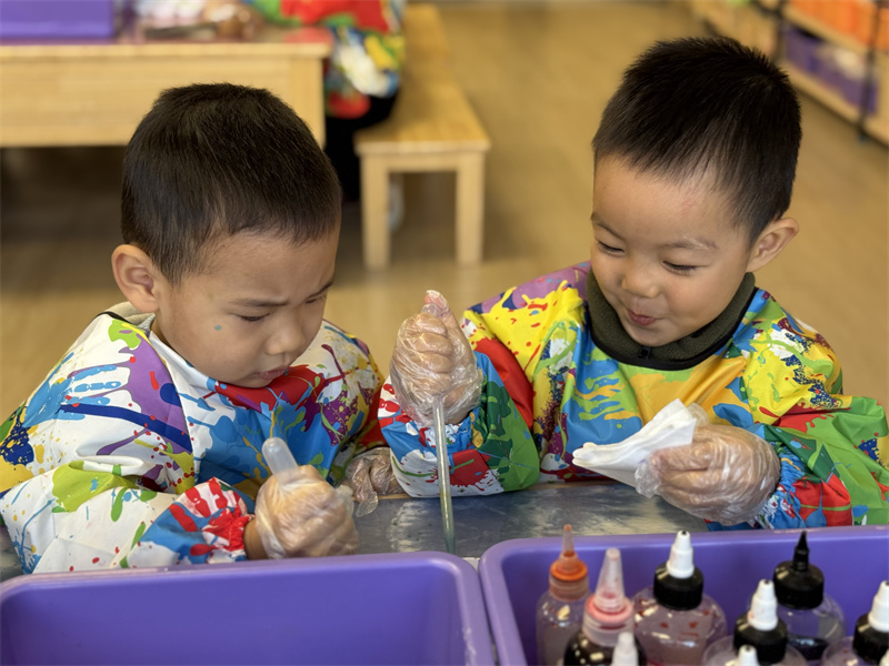 活动开始前,老师引导幼儿观察扎染的折叠、染色等步骤,并强调了操作过程中的安全注意事项。在实际操作环节,幼儿化身小小艺术家,发挥自己的想象力,将纸巾对折再对折,扎出整齐的褶皱;有的孩子随意折叠,想要创造出不规则的图案;还有的孩子互相交流技巧,分享自己的创意想法。在染色环节,幼儿小心翼翼地将折叠好的纸巾浸入各色染料中,看着纸巾逐渐被染上鲜艳的色彩,脸上洋溢着兴奋的笑容。