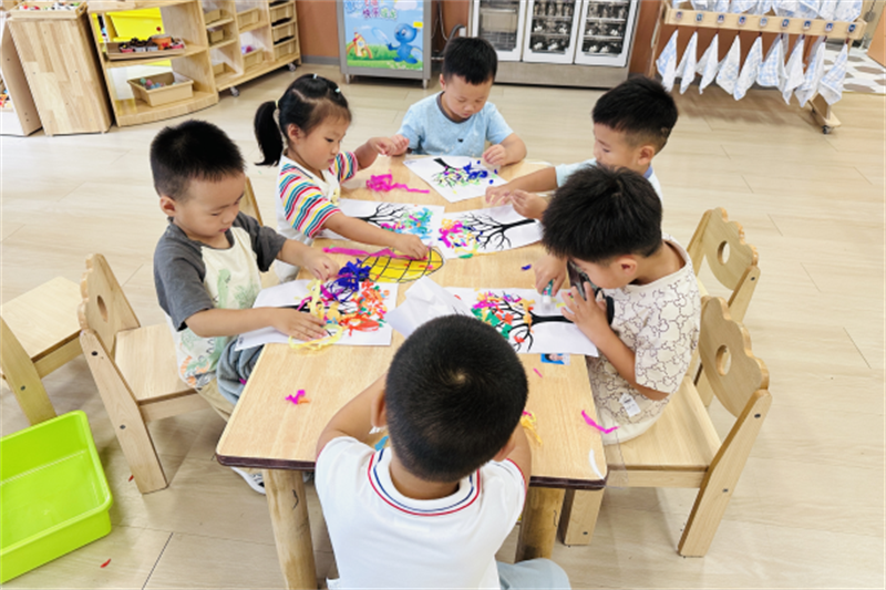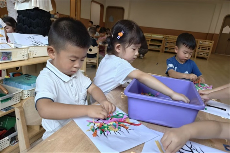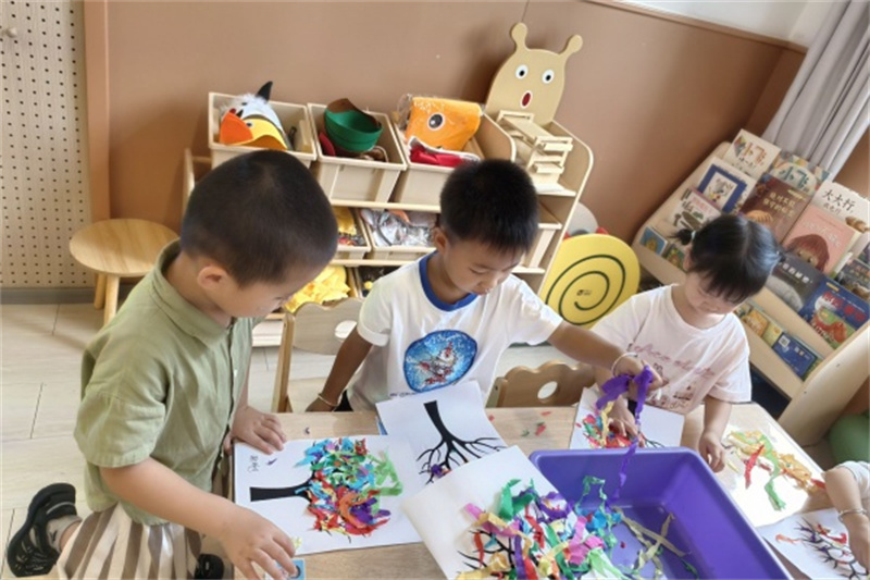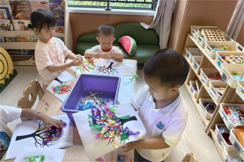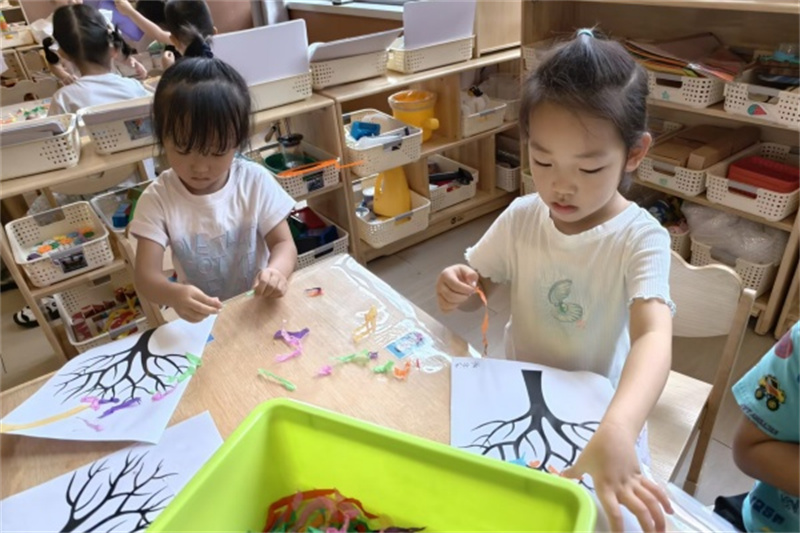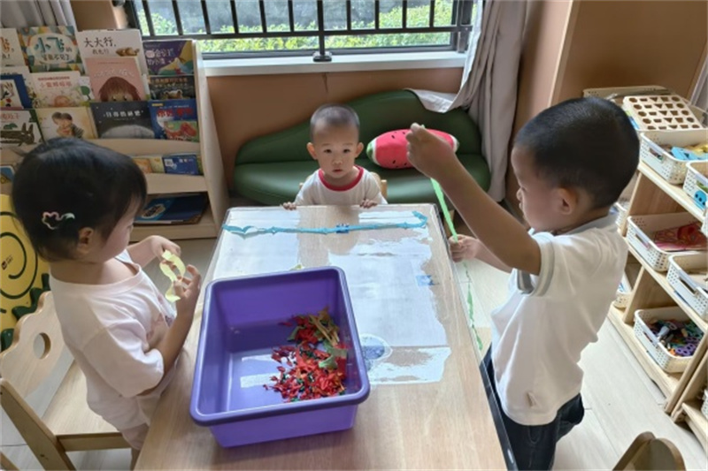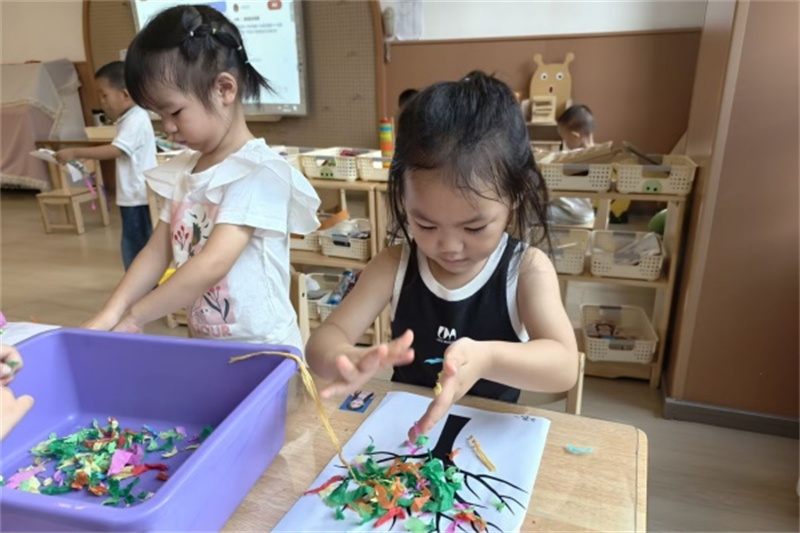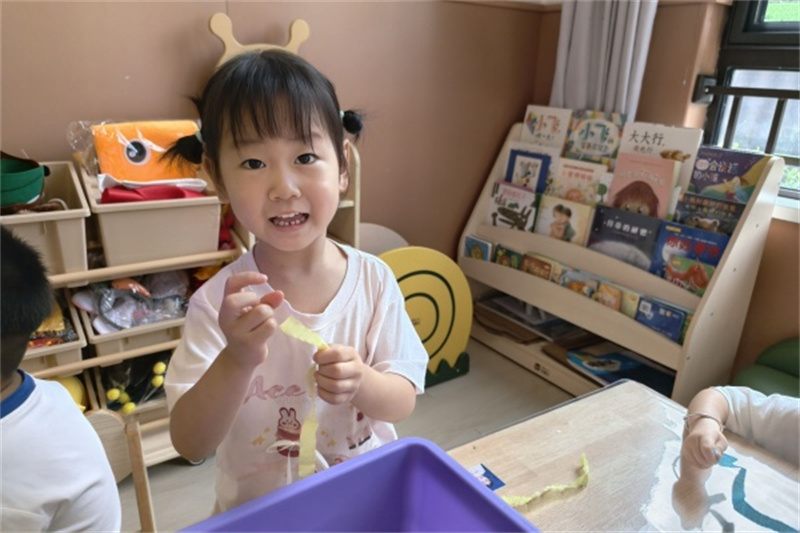 孩子们用大拇指和食指轻轻捏着纸条,慢慢地撕出弯弯的“树叶”!有的撕成了精致的小圆叶,有的则撕成了细长的柳叶状,还有的创造出了各种不规则的形状。孩子们在操作中锻炼了手眼协调能力,同时也收获了满满的“我能做到”的成就感。