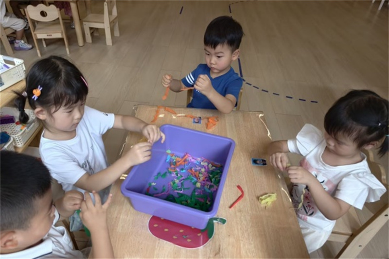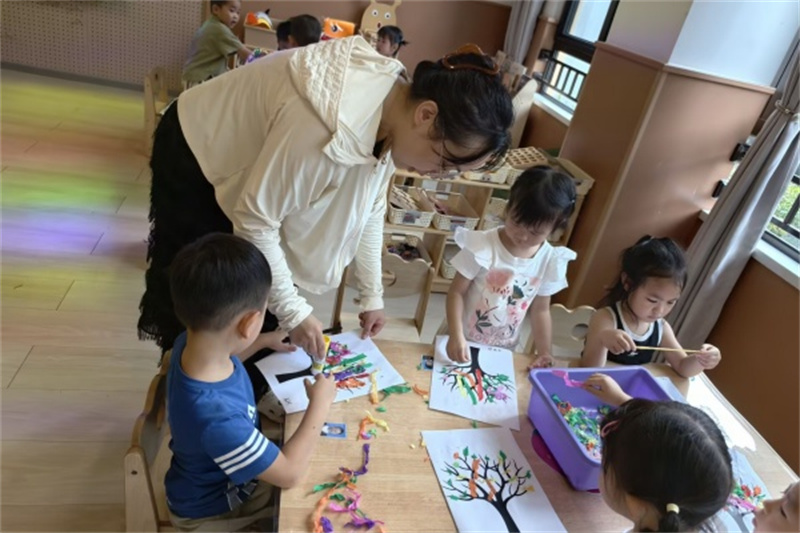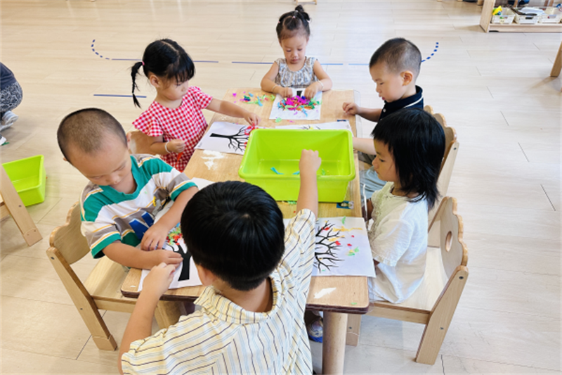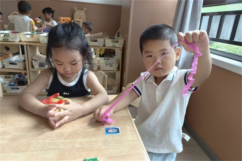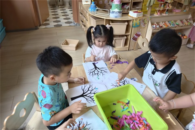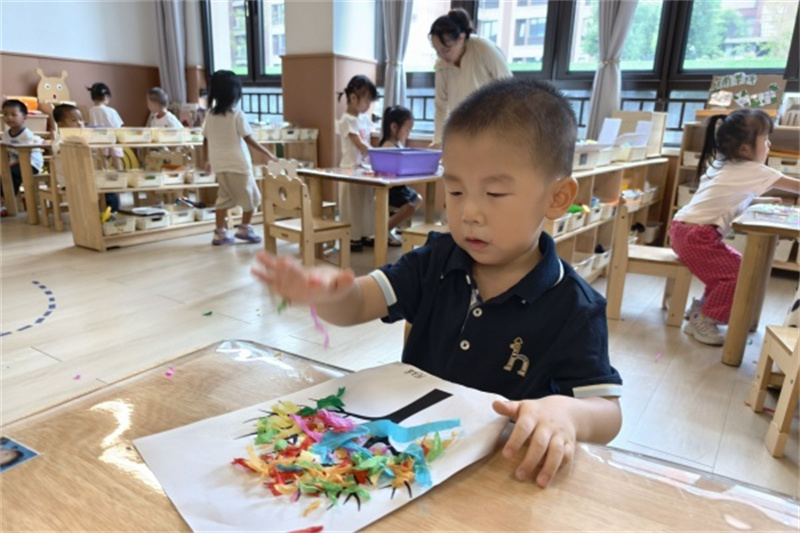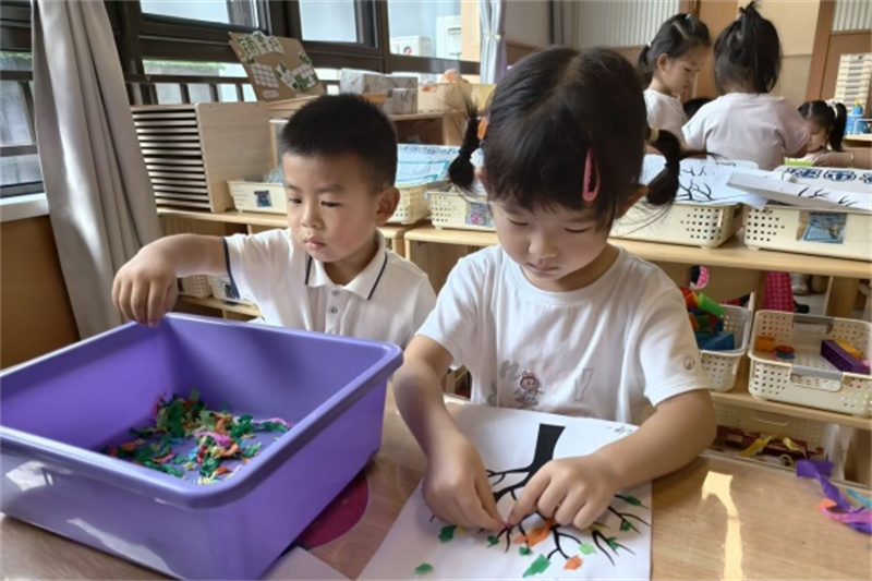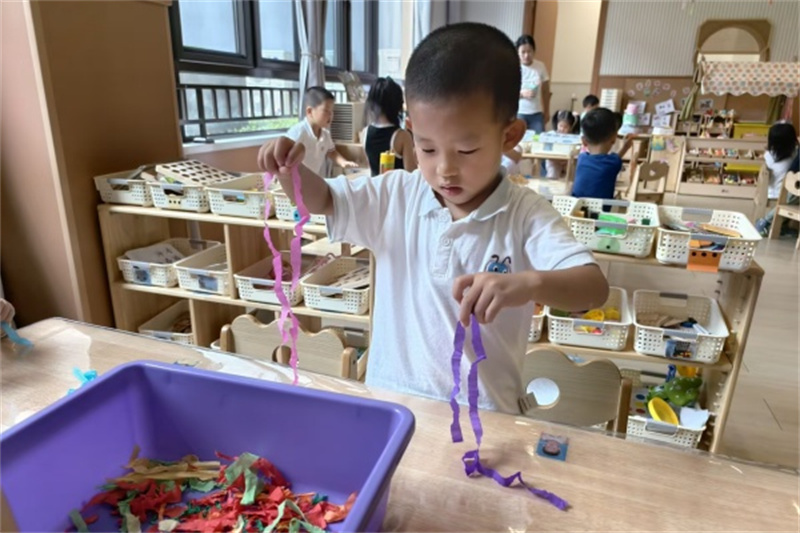 孩子们用大拇指和食指轻轻捏着纸条,慢慢地撕出弯弯的“树叶”!有的撕成了精致的小圆叶,有的则撕成了细长的柳叶状,还有的创造出了各种不规则的形状。孩子们在操作中锻炼了手眼协调能力,同时也收获了满满的“我能做到”的成就感。