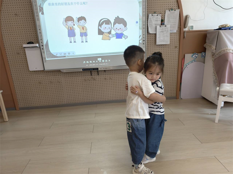 活动中,老师用图片导入,利用图谱带领孩子们学唱歌曲《找朋友》,并通过模仿小动物、玩“听指令找朋友”等游戏,引导他们在音乐活动中认识新伙伴。在“找朋友”游戏中,孩子们勇敢地与同伴握手、拥抱,体验到了交朋友的快乐。最后,老师和孩子们一起歌唱《找朋友》,在欢快的歌声中,孩子们的脸上洋溢着笑容,对幼儿园生活充满了期待。