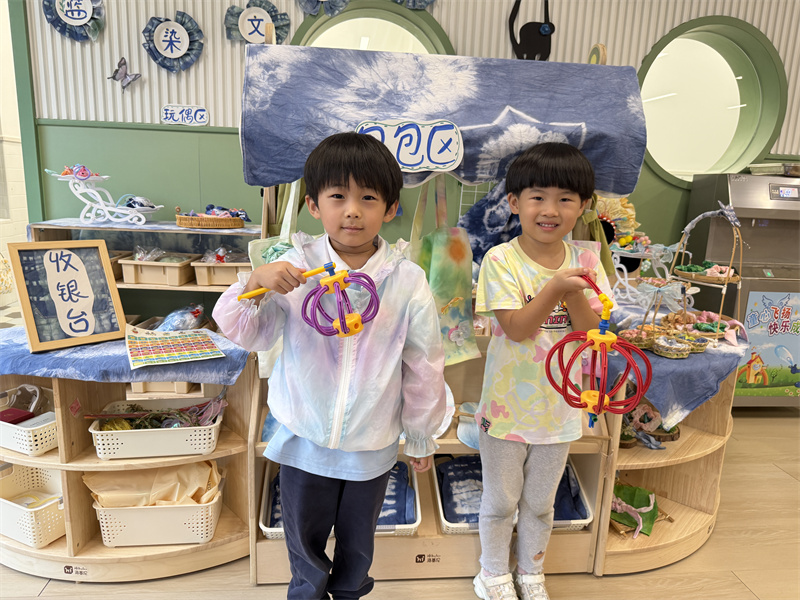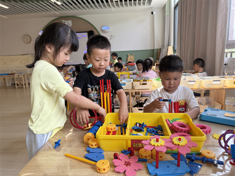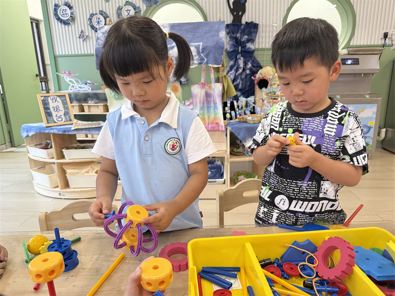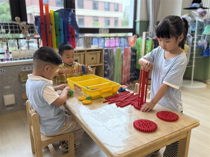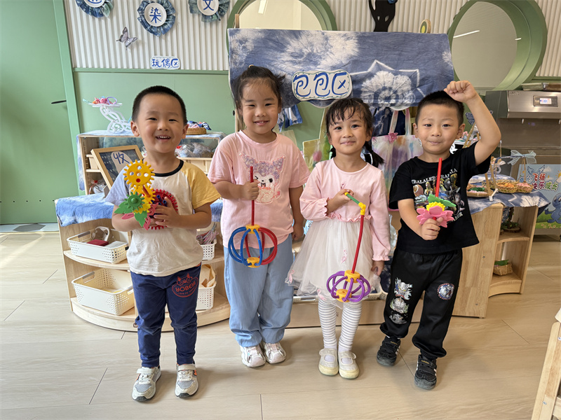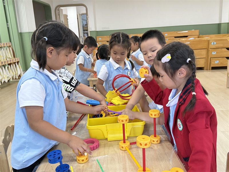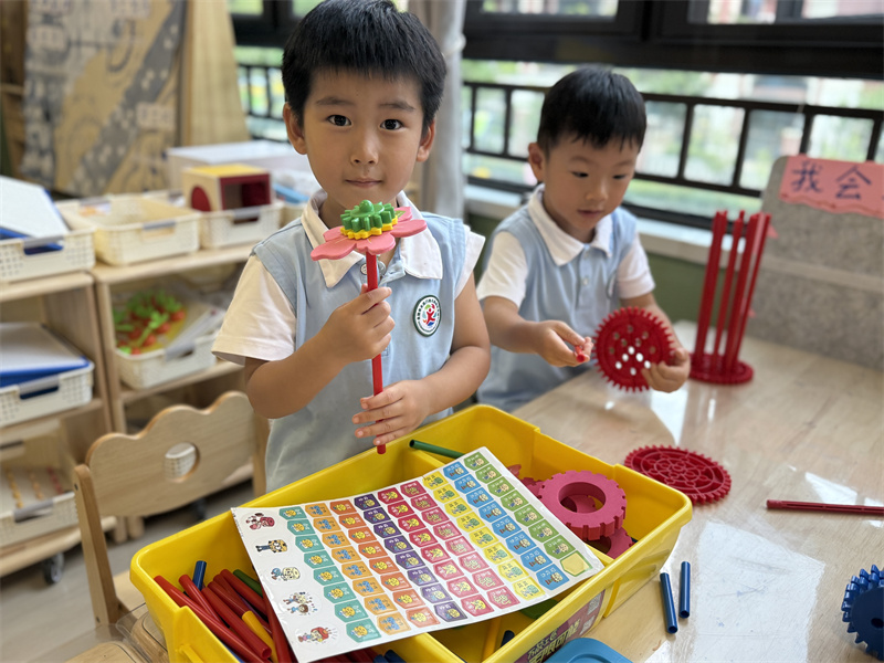活动中,孩子们自由分组,有的搭建“摩天轮”,有的专注拼装“红灯笼”,还有的发挥想象,组合出造型独特的“恐龙”“花朵”。过程中,他们时而低头专注拼接,时而与同伴小声讨论,小小的积木在孩子们手中仿佛被赋予了生命,原本零散的零件,经过拼、插、拧、转等动作,渐渐变成一个个充满童趣的作品。当自己的“杰作”完成时,孩子们兴奋地举起作品向小伙伴展示,脸上洋溢着自豪与喜悦。