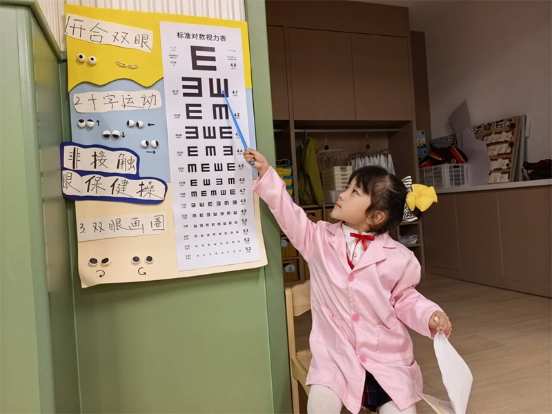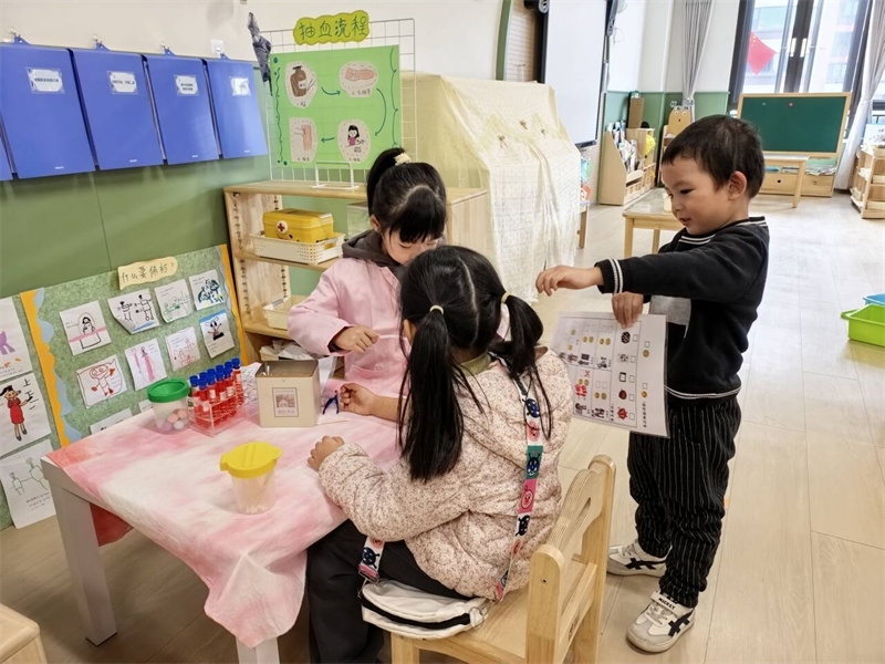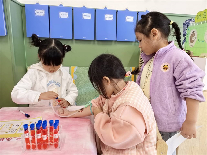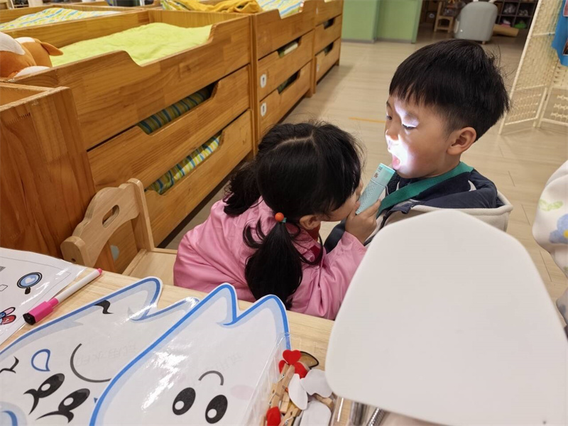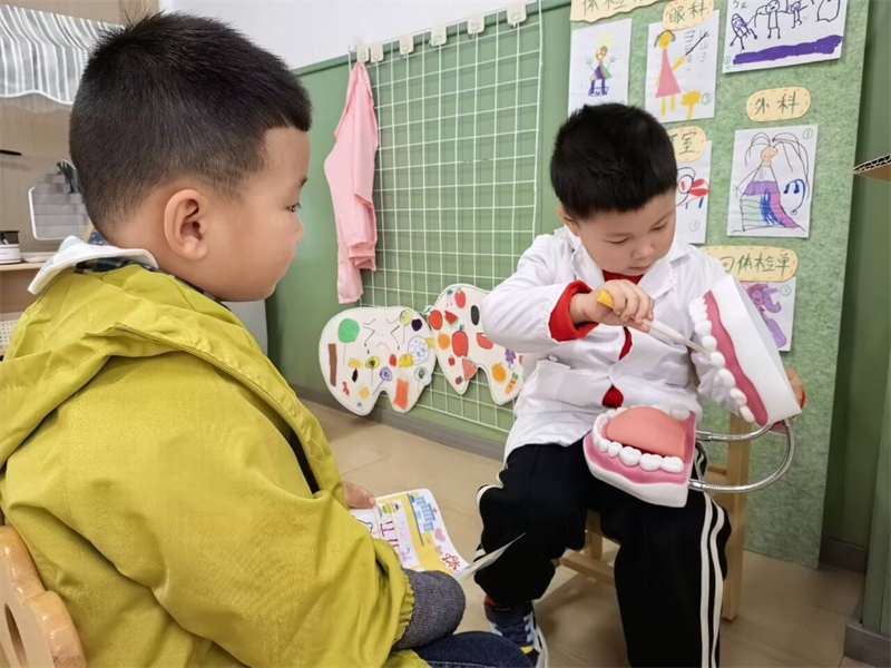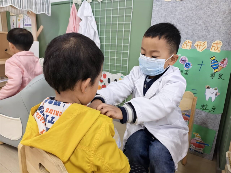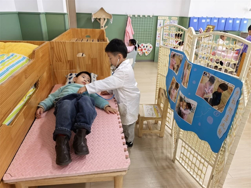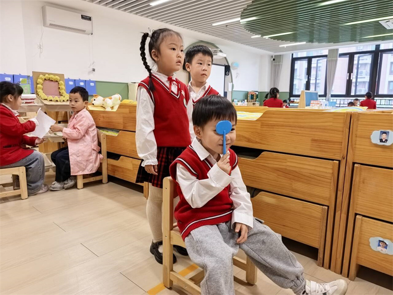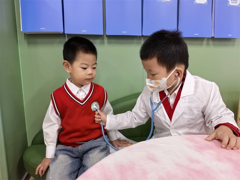 活动中,孩子们自主选择“小医生”“小患者”等角色,穿上“白大褂”,拿起听诊器、视力表、CT检测仪模型等道具,认真地模仿医生的工作。眼科的“小医生”仔细为“患者”检查视力;在牙科诊室内,他们耐心叮嘱“患者”要勤刷牙、少吃甜食;在CT检查区和采血区,“小医生”们一边温柔安抚紧张的“小患者”,一边规范地完成“检查”和“采血”操作,整个过程有模有样,尽显专业风范。