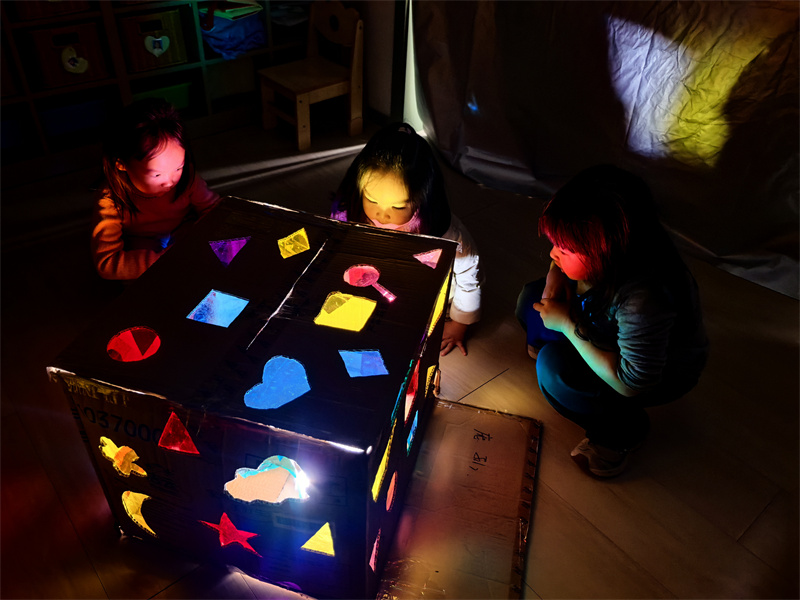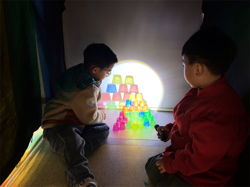 “影子为什么总跟着我跑?”“它是从太阳里掉下来的吗?”孩子们对着墙面比出小手,“我变得小兔子在蹦跳!”“我的螃蟹横着走呢!”蝴蝶、孔雀……简单的手影在光的映衬下栩栩如生。当有人问“影子能变颜色吗?”,大家立刻冲进光影屋,用彩色杯子搭建出一座“金字塔”,果然在墙上看到了粉色、蓝色的影子,欢呼声此起彼伏。