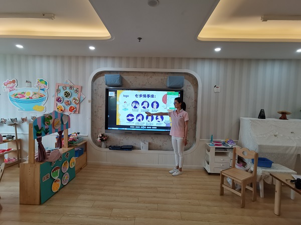 寓教于乐,教师将七步洗手法融入儿歌中,“小朋友,来洗手。卷起袖,淋湿手。抹上肥皂搓呀搓,清清水里冲一冲,再用毛巾擦一擦,我的小手真干净。”“搓搓搓,搓手心,搓搓搓,搓手背,搓搓搓,手指缝。搓搓搓,搓手腕。冲冲冲,冲干净,关上龙头甩三甩,一二三,真干净!”通过这些简单有趣的儿歌,孩子们轻松的学会了洗手腕、手尖和手指缝的方法。一边哼着儿歌一边按照老师讲解的方法认真的将小手洗的干干净净。