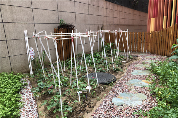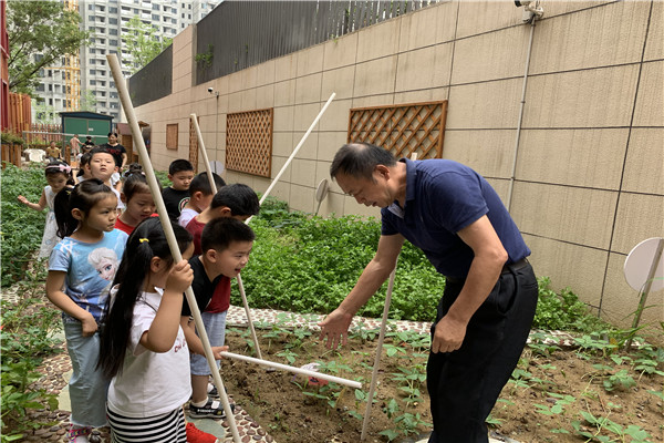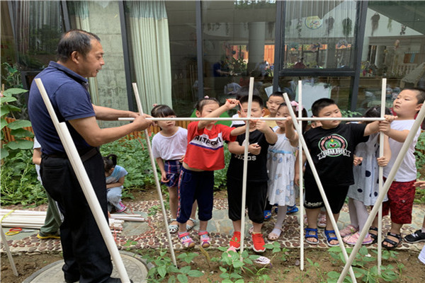 活动开始前,詹老师通过图片的方式向小朋友们介绍了豆角架的作用,紧接着,小朋友们来到小菜园开始插豆角架啦!小朋友们找来搭豆角架要用的管子和绳子,可是,要怎么搭呢?“我知道,我知道,把管子插在豆角旁边就可以了。”“可是风一吹就容易倒啊!”“中间再加一根管子固定一下不就好了……”小朋友们七嘴八舌的讨论起来。“那我们一起来试一试吧!”瞧,小朋友们在门卫叔叔的帮助下,有的插管子,有的用手扶着管子,有的系绳子,忙的不亦乐乎。不一会儿,一排排整齐的豆角架就搭好了。
