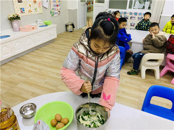紧接着将盐、蛋液和碎菜叶等放入调好的面糊里,把电饼铛预热好以后,孩子们迫不及待地说:“快开始做香喷喷的饼吧!”在老师的帮助下,小朋友们倒好油,盛了一小勺面糊,倒匀以后,奇妙的事情发生了,面糊迅速的膨胀起来,随之香味也弥漫出来,很快煎饼做好了,再撒上葱花,美味的蔬菜饼就出锅了。孩子们迫不及待的想要尝一尝自己制作的蔬菜饼,你一口我一口,他们说道:“蔬菜饼好香呀,我还想再来一块!”。从生活体验馆传出的香味充满了整个楼道……