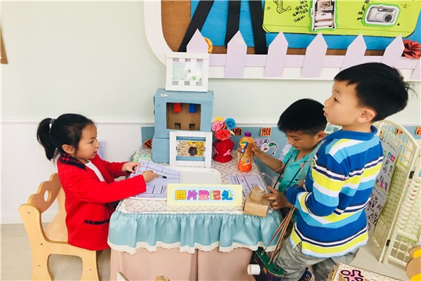 角色区:《彩虹照相馆》里的工作人员各就各位,热情等待前来拍照的顾客。拍照登记处,店长耐心的帮助顾客登记信息。在梦幻世界的背景前,摄影师正在教顾客摆姿势,顾客根据摄影师的指导摆出了美美的姿势,而画师小朋友则一丝不苟的绘画着眼前的美丽场景。