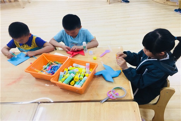美工区:《彩虹制作坊》里小朋友们正在制作风车。裁纸、剪纸、粘贴……孩子们熟练的操作,不一会儿风车就制作完成啦!