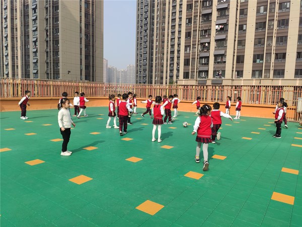 满怀期待的小足球员们有序的站在足球场地上,等待着老师的指令。虽然对足球并不是很熟悉,但是并不影响他们对足球的喜爱。有趣的传接球活动让孩子们很快的融入到了运动中,增强了彼此间的默契,肆意地奔跑在操场上。