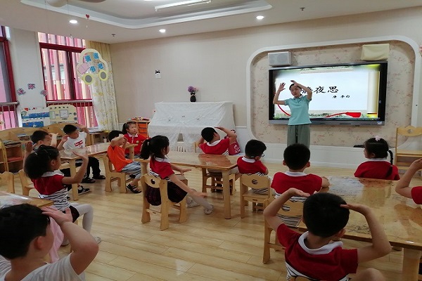 “床前明月光,疑似地上霜。举头望明月,低头思故乡。”朗朗上口的诗句,大一班的小朋友们信手拈来,其实韵律优美的古诗不仅适合朗诵、吟唱,还可以结合小朋友们最喜欢的手指游戏呢!瞧!老师用简单的手指动作代表着诗句内容进行演绎,小朋友们也纷纷伸出了自己的小手跟随着老师有模有样的做着游戏,《游子吟》《清明》《赠汪伦》这些优美的古诗在小朋友的演绎下散发出了不一样的魅力。