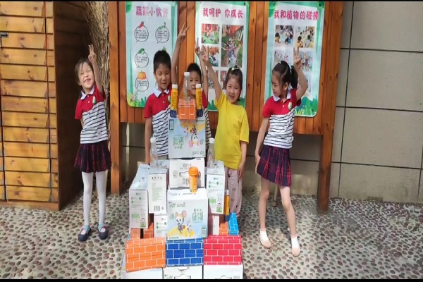 只见孩子们先将所要用到的材料都搬了出来,将最大的牛奶箱平铺到最下面当地基,再将玩具砖块竖着围起来做上层搭建,后将饮料瓶作为装饰点缀火神山医院。最后再看看有没有哪里需要添加的地方,用剩下来的材料将其补上。