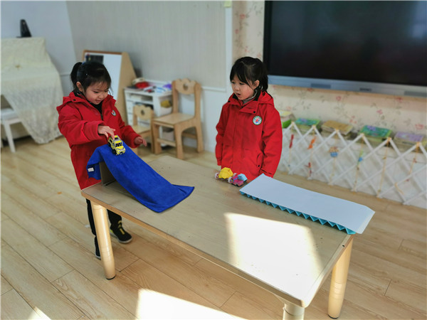 随即教师开始实验,孩子们发现A4纸面的小车跑得距离最远,毛巾面次之,波浪面最近。原来,物体表面越光滑,受到的摩擦力越小;物体表面越粗糙,受到的摩擦力越大。所以小车从相同高度的斜坡放下,在较平滑的面滑行的距离最远,在波浪面滑行距离最短。接下来幼儿开始尝试进行操作,“哇,我的小车跑得远。”“我的小车跑不动到了。”活动气氛达到了高潮,整个活动室充满了小朋友们的欢声笑语。