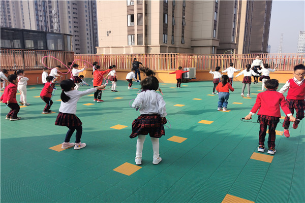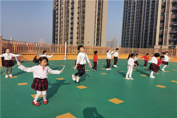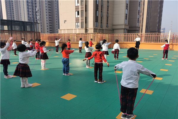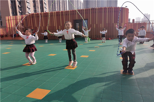 金秋的阳光温馨恬静,秋风和煦轻柔。为了促进幼儿体能的发展,增强幼儿体质,2020年10月12日,合肥市大西门幼儿园教育集团森林城分园大八班的小朋友开展了学习跳绳的活动。